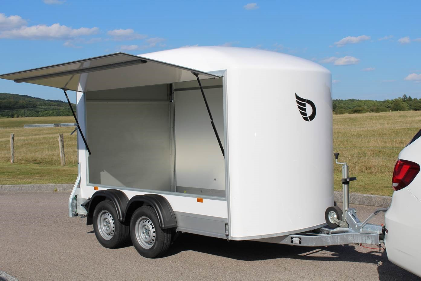 A dual axle box van trailer with a large side opening hatch. The sides are manufactured with Plywood Sides. The roof and front are in a one-piece polyester. The 2 in 1 ramp/door is in aluminium.