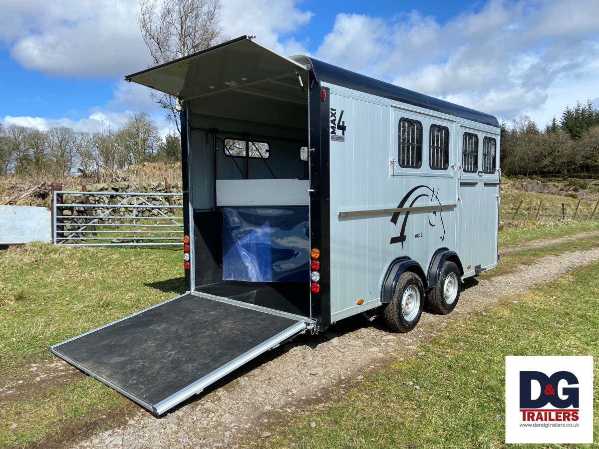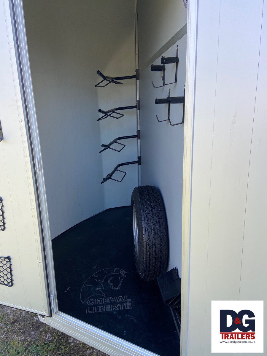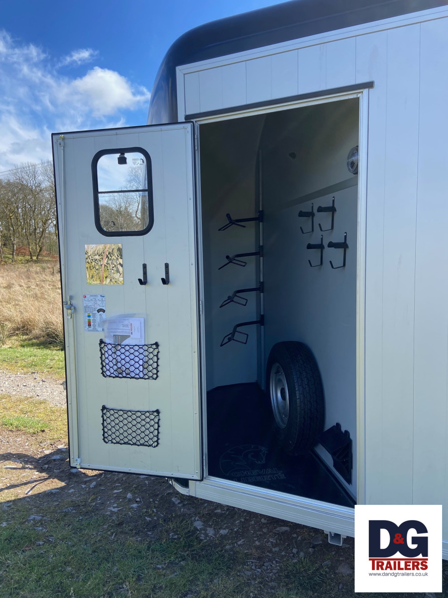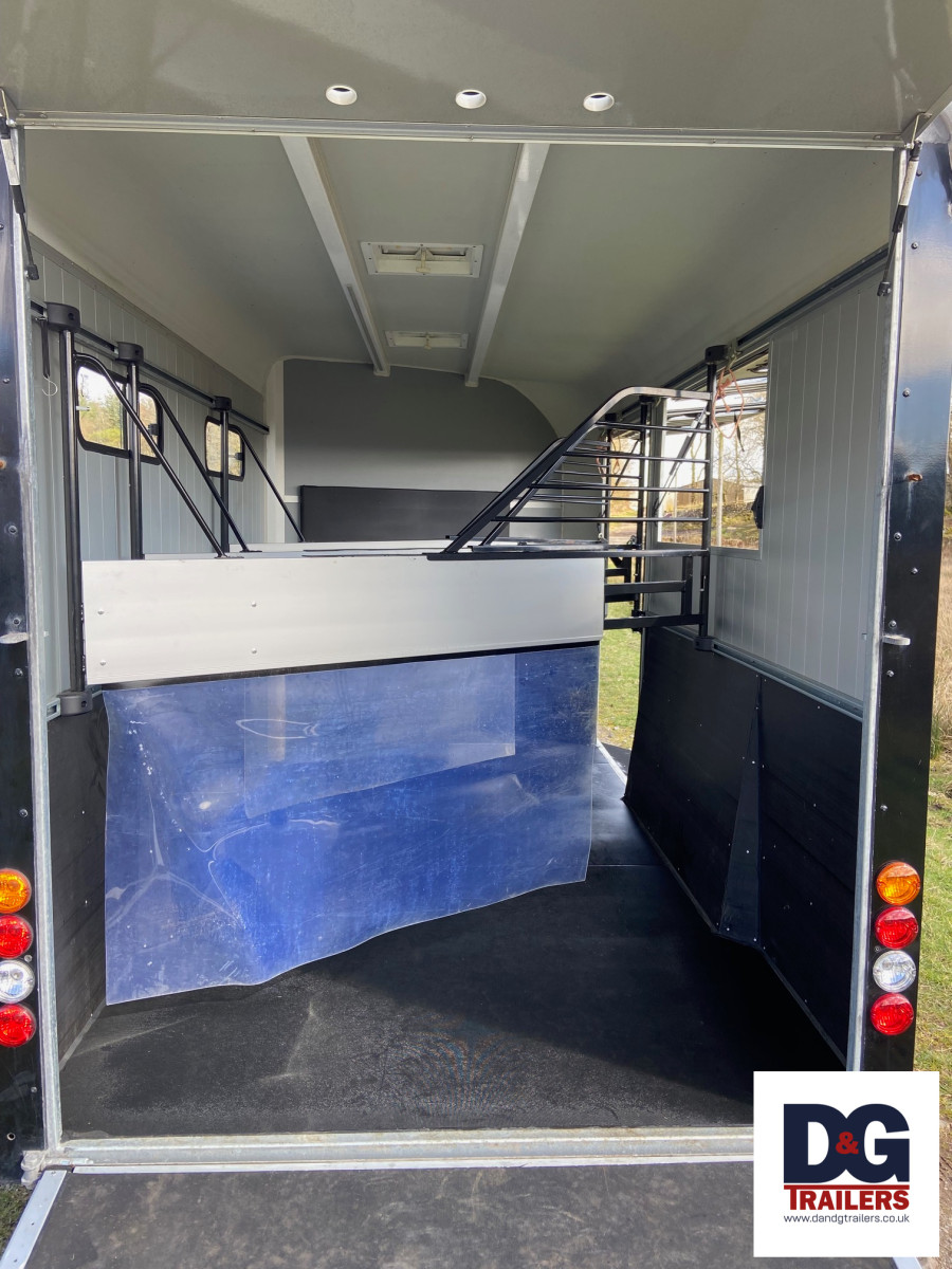 A herringbone partitioned three horse or four pony trailer, with its own spacious tack room and three telescopic adjustable partitions on sliding tracks.