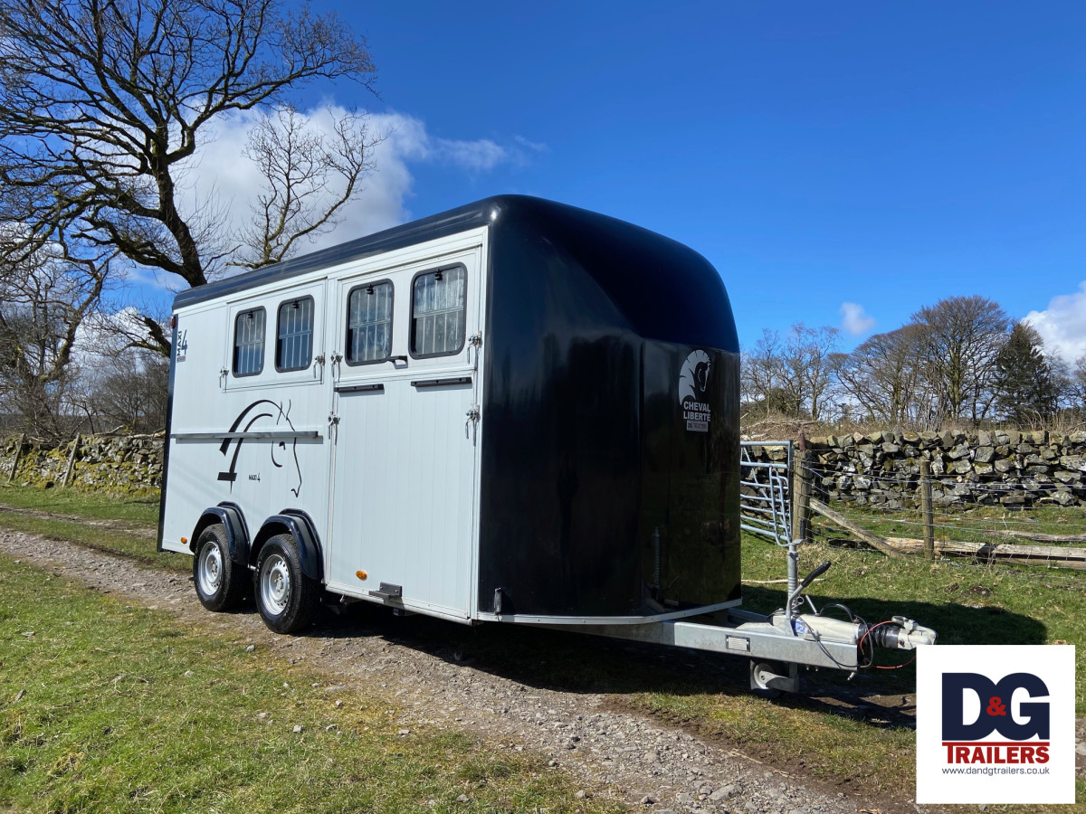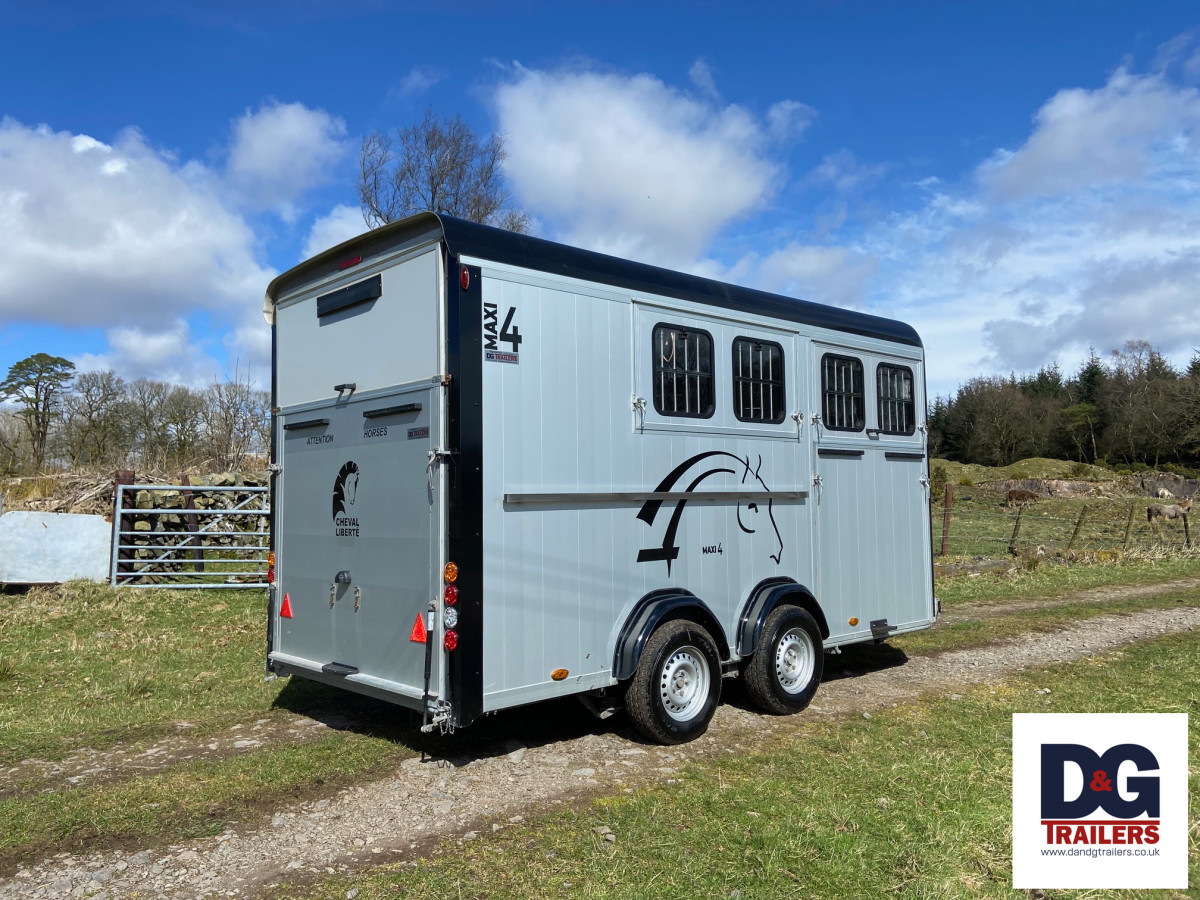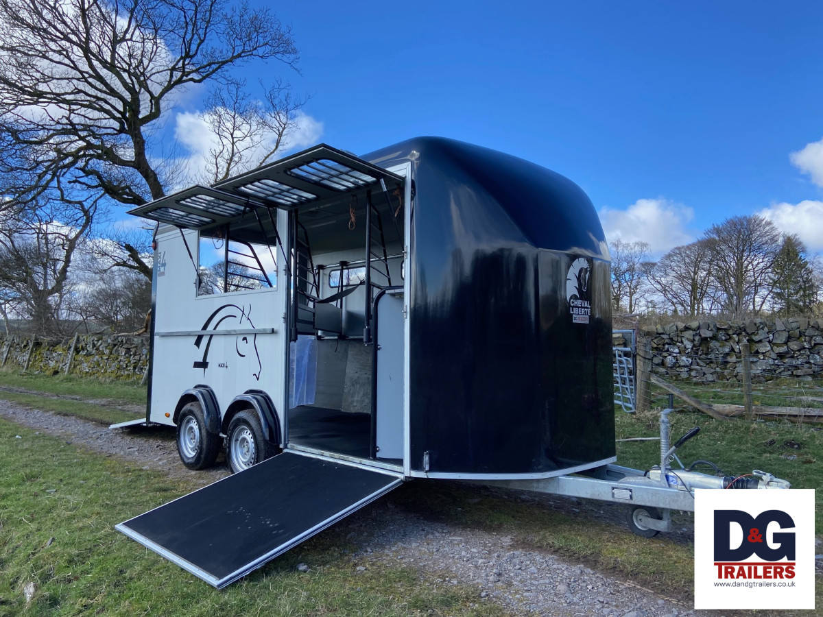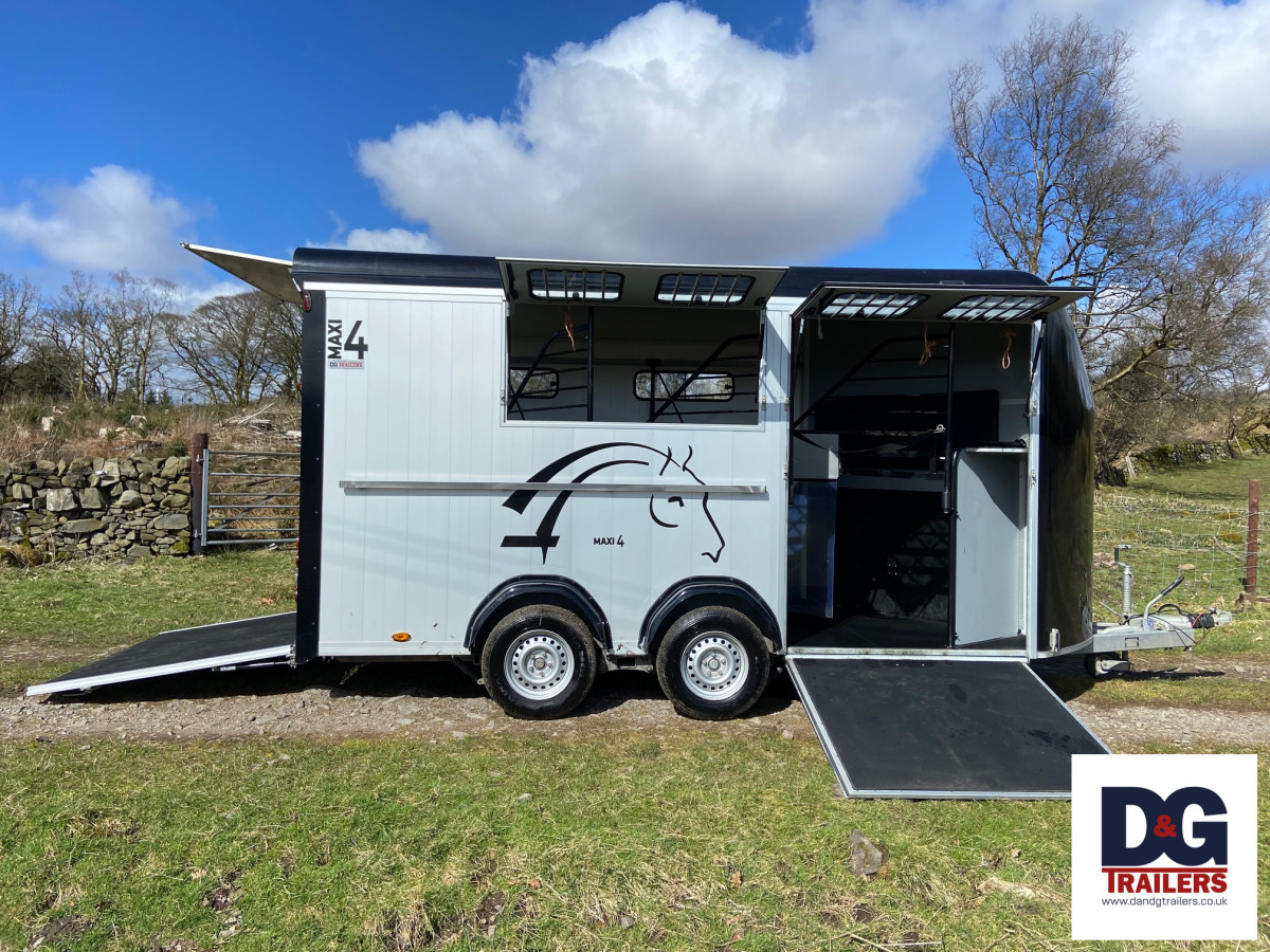 A herringbone partitioned three horse or four pony trailer, with its own spacious tack room and three telescopic adjustable partitions on sliding tracks.